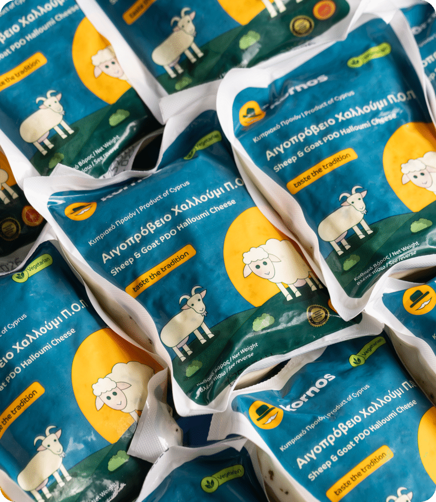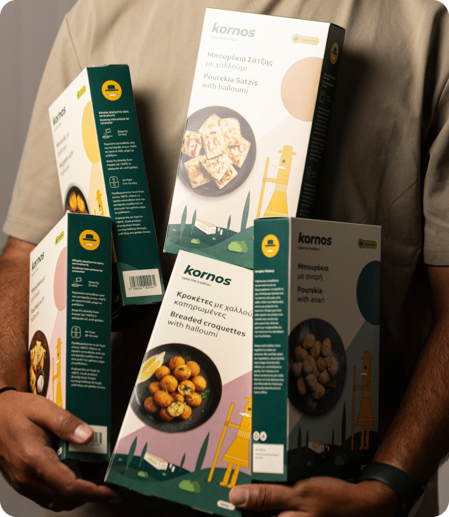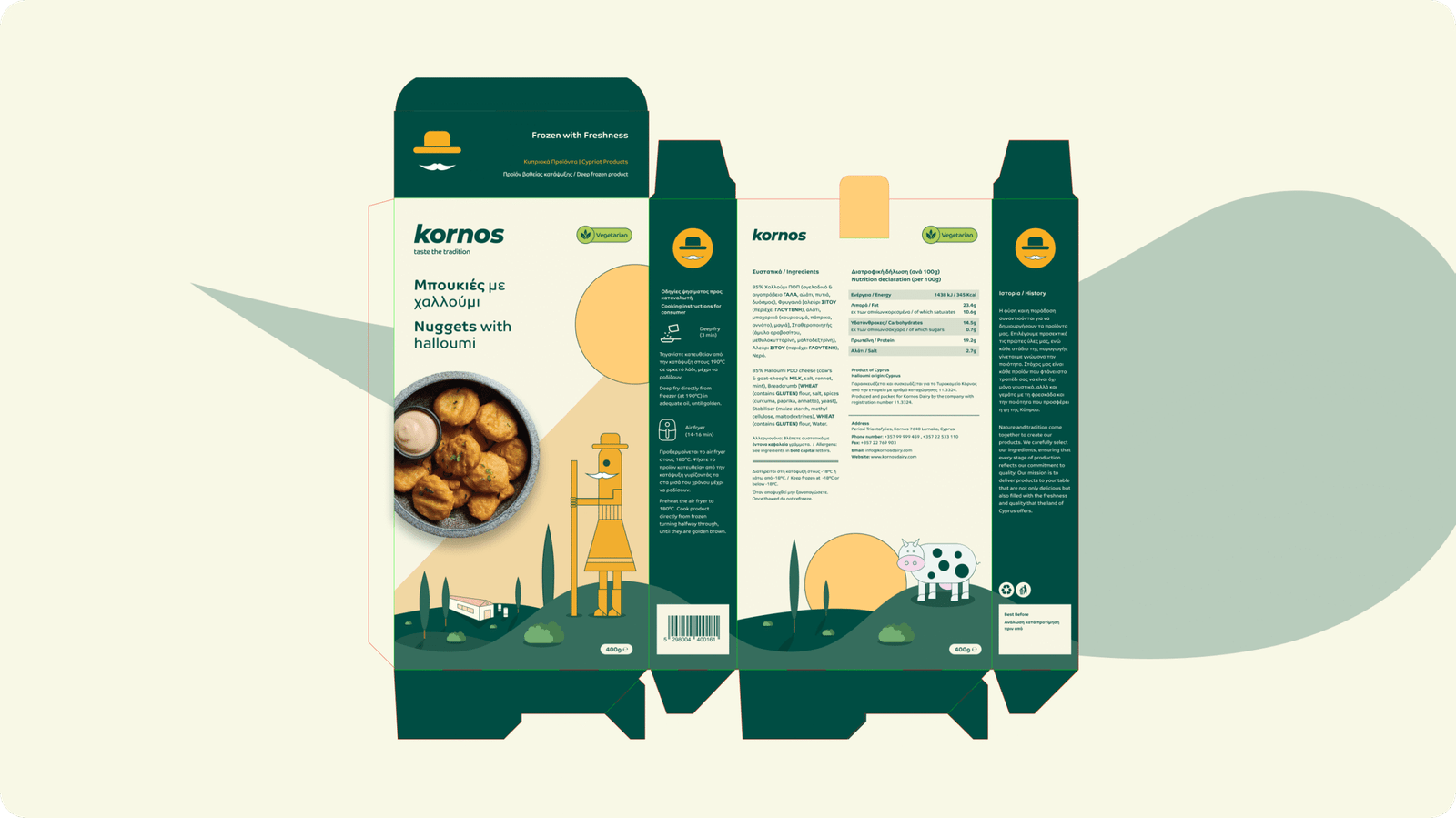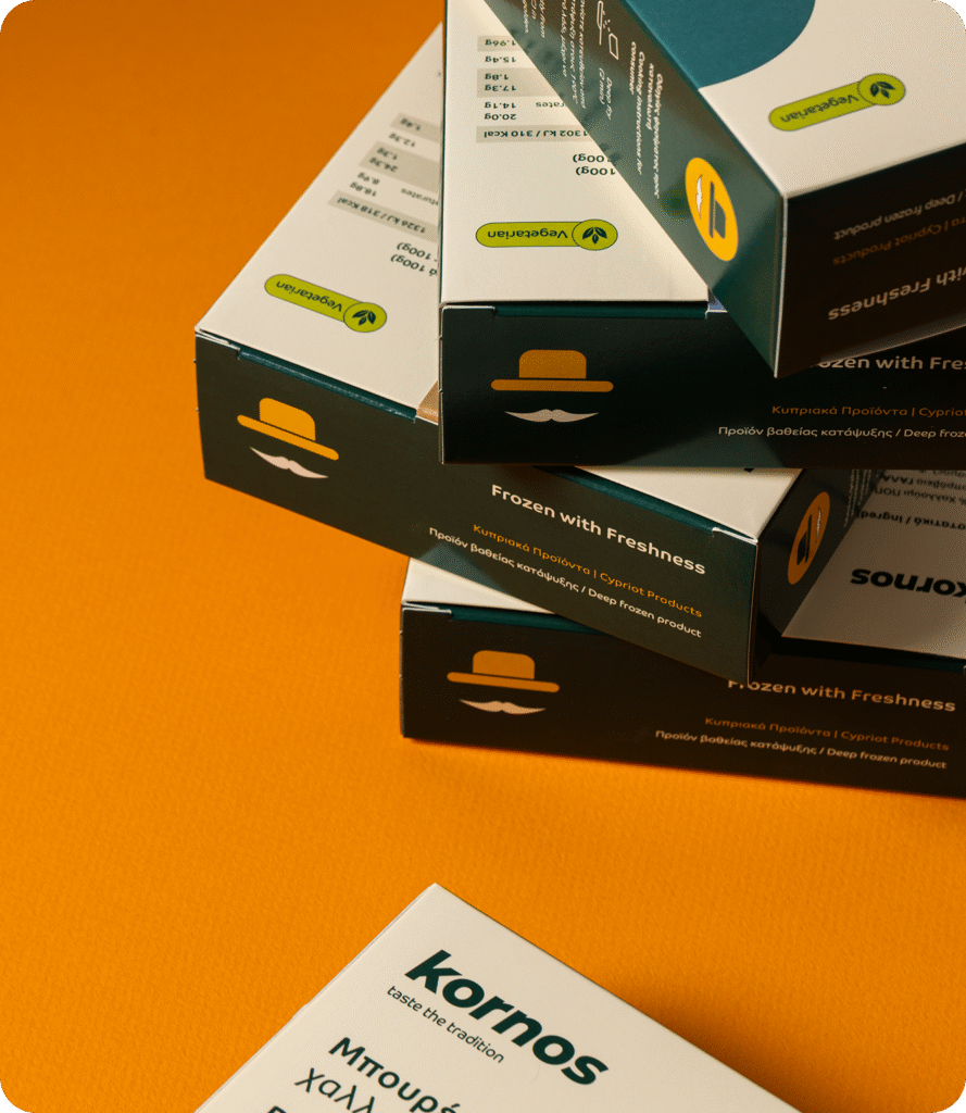 For Kornos Dairy, rooted in Cypriot tradition, we developed a brand identity that blends heritage with contemporary design. The logo is inspired by the iconic hat and moustache of a traditional Cypriot shepherd—symbols of authenticity, simplicity, and local character. Combined with clean lines, modern typography, and a versatile color palette, the branding positions Kornos as both proudly traditional and confidently modern.